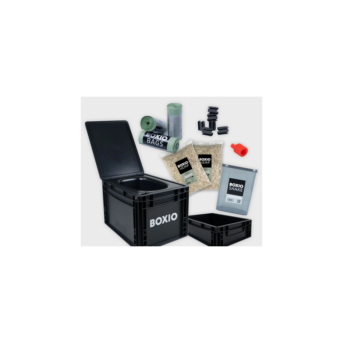 Le kit de démarrage MAX+ est complet : il inclut les toilettes au format Eurobox, un rehausseur SOLO-UP (+12cm de hauteur) pour un confort accru et un rangement additionnel pour la litière, le papier toilette et les sacs. Le kit contient aussi un bouchon "Plug" pour les déplacements, deux sacs de litière de chanvre 100% naturelle, trois rouleaux de sacs biodégradables, un récipient pour la litière et six clips Boxio pour stabiliser l'ensemble.
