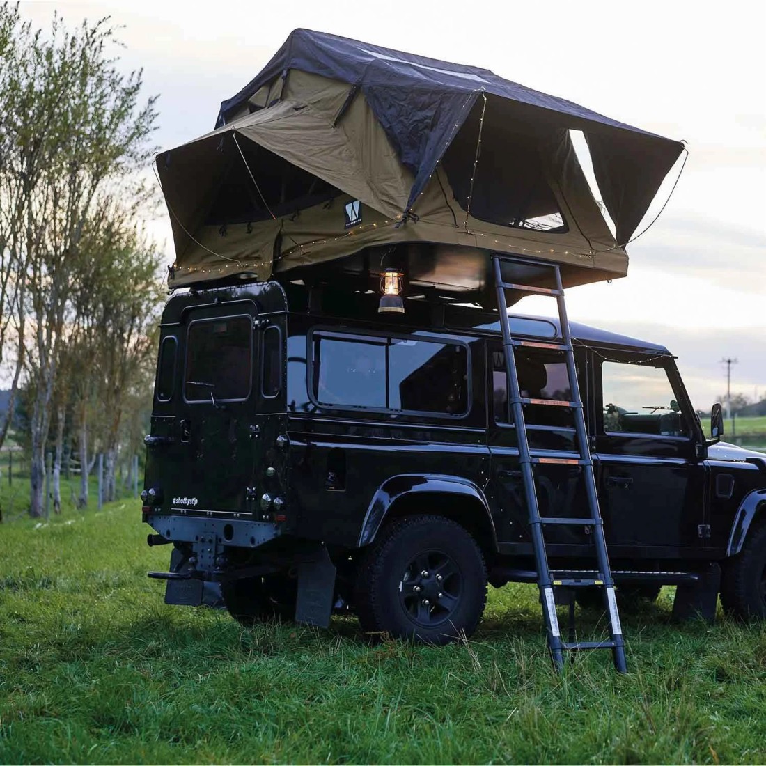 Cette tente de toit est livrée avec un équipement complet pour un confort optimal : deux sacs à chaussures, un éclairage LED ajustable intégré, un filet de rangement sous la tente, un matelas en mousse à mémoire de forme, ainsi qu’une échelle télescopique.
