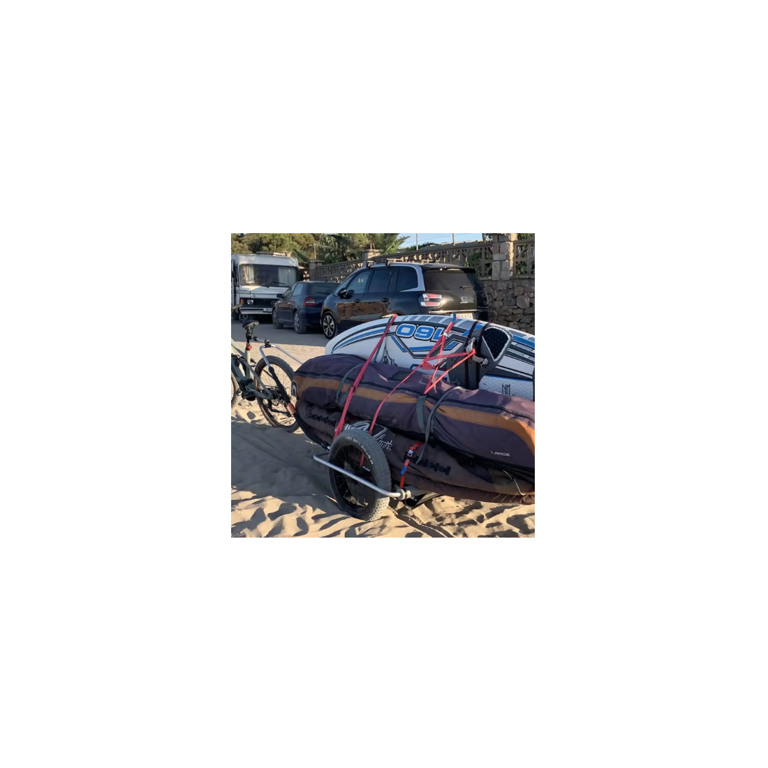 Le Thule Reacha Sport Beach est une remorque de vélo à gros pneus, modulaire, en aluminium anodisé, offrant une capacité de charge de 35 kg en mode vélo et jusqu'à 60 kg en mode chariot à main. Grâce à son bras d'attelage extensible, elle peut transporter des objets jusqu'à 4,5 mètres de long, tels que des planches de surf, des kayaks ou des planches à pagaie (SUP). Son design ajustable et pliable permet une utilisation flexible et un rangement compact.