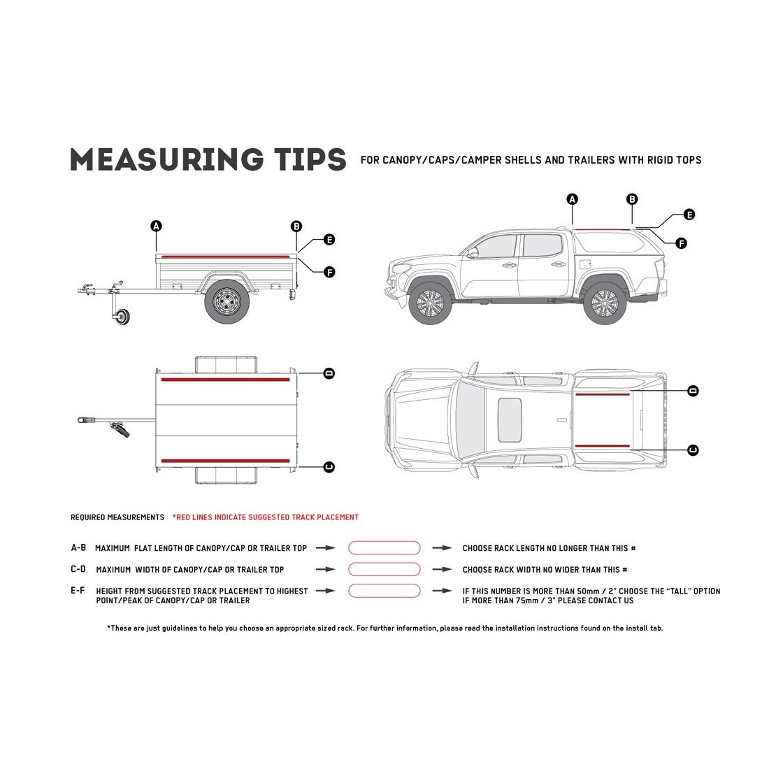 Ce kit de galerie est destiné au hard top de Pick-Up/aux cellules de camping et aux remorques qui ont une dimension de toit approximative de 1165mm/45.9'' (W) x 1358mm/53.5'' (L). Le plateau Slimline II s’installe sur les six (6) pieds fournis qui glissent dans les rails fournis. Les 3 x140mm/5.5''paires de rail d'une peuvent facilement être montée sur votre hard top/cellule ou remorque. Regardez le guide d’installation pour le montage des rails dans l'onglet INSTALL pour plus de détails.