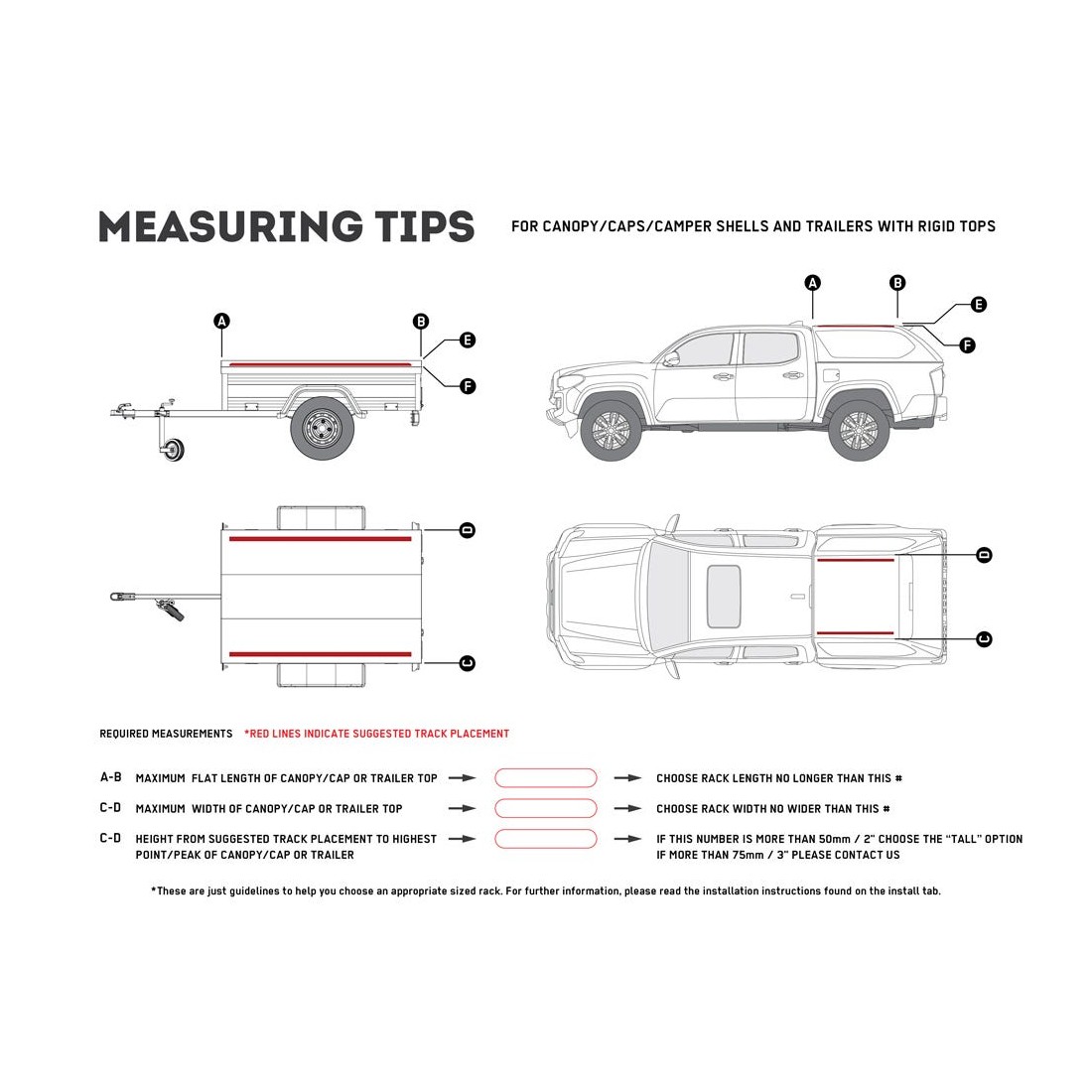 Ce kit de galerie est destiné au hard top de Pick-Up/aux cellules de camping et aux remorques qui ont une dimension de toit approximative de 1165mm/45.9'' (l) x 1762mm/69.4'' (L). Le plateau Slimline II s’installe sur les six (6) pieds fournis qui glissent dans les rails fournis. La paire de rail d'une longueur de 1600mm/63'' peut facilement être montée sur votre hard top/cellule ou remorque. Regardez le guide d’installation pour le montage des rails dans l'onglet INSTALL pour plus de détails.