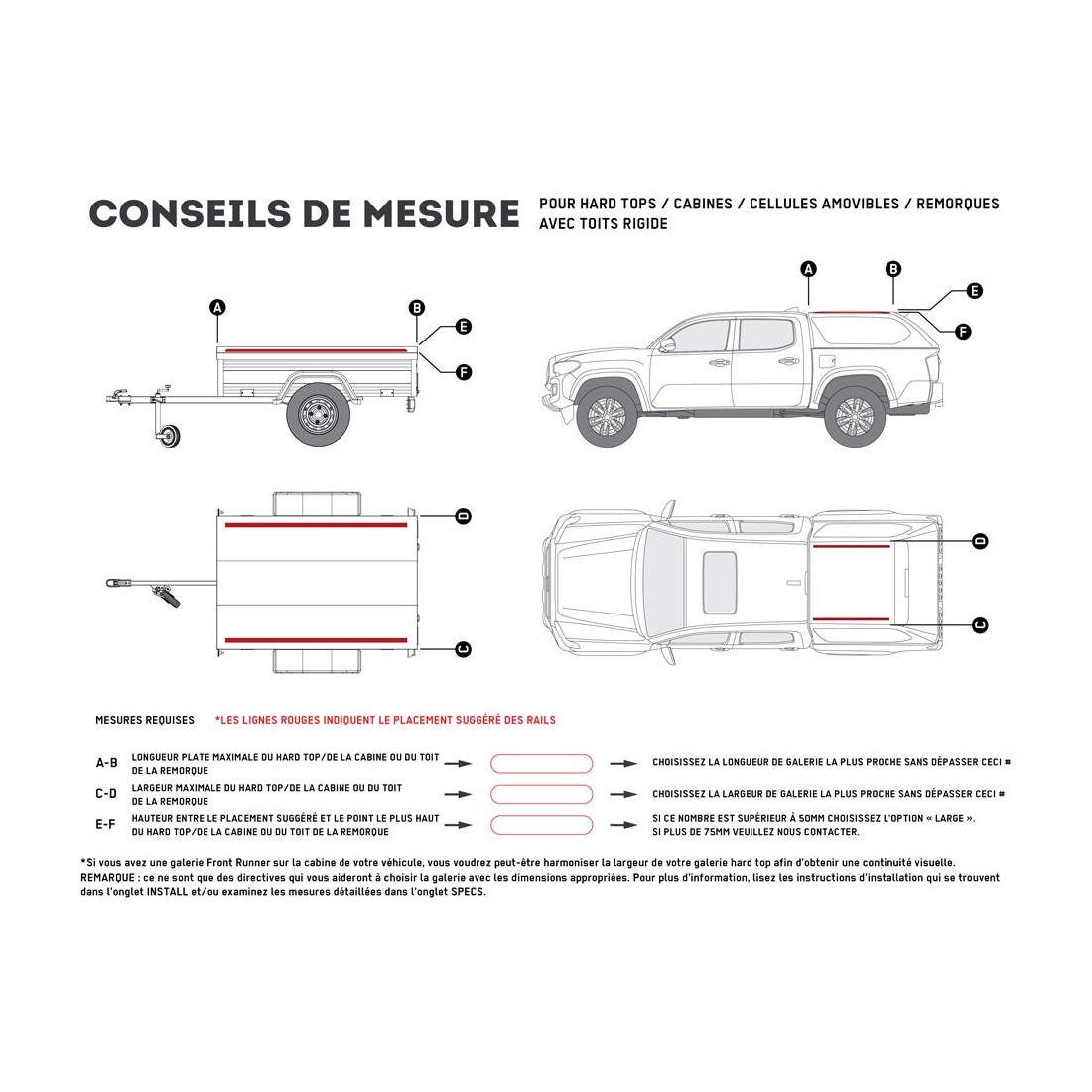 Ce kit de galerie est destiné au hard top de Pick-Up/aux cellules de camping et aux remorques qui ont une dimension de toit approximative de 1165mm/45.9'' (l) x 1762mm/69.4'' (L). Le plateau Slimline II s’installe sur les six (6) pieds fournis qui glissent dans les rails fournis. La paire de rail d'une longueur de 1600mm/63'' peut facilement être montée sur votre hard top/cellule ou remorque. Regardez le guide d’installation pour le montage des rails dans l'onglet INSTALL pour plus de détails.Toutes les galeries de Front Runner sont accompagnées d'un guide d’installation, tout comme les composants nécessaires pour installer le plateau Slimline II sur votre véhicule.Toutes les galeries de Front Runner sont couvertes par une Garantie de Durée Limitée* * Note : Une vitesse de conduite maximale de 130km/80mi par heure doit être respectée lorsque le véhicule est équipé d'un kit de barres de toit ou de barres de charge Front Runner.