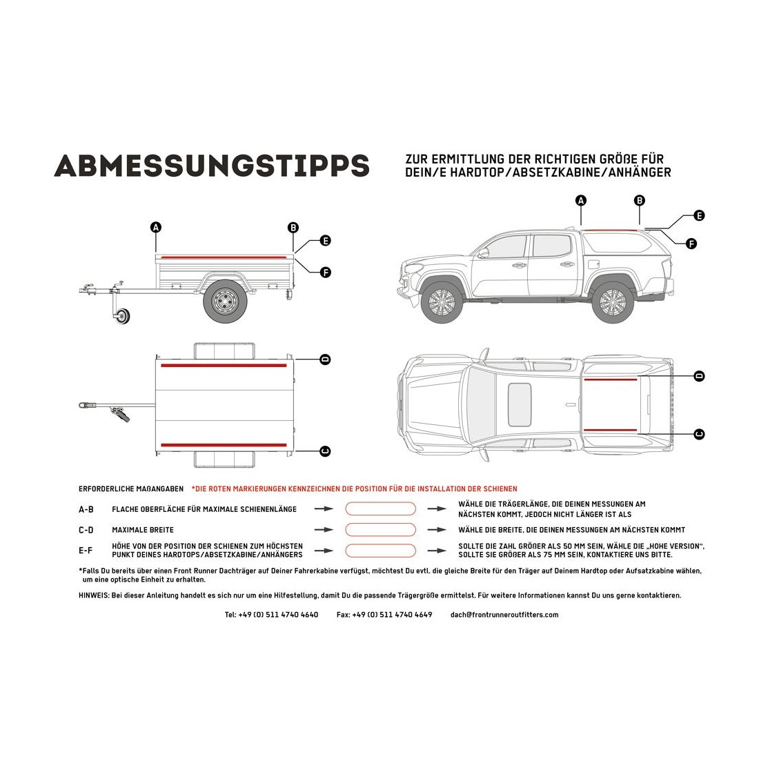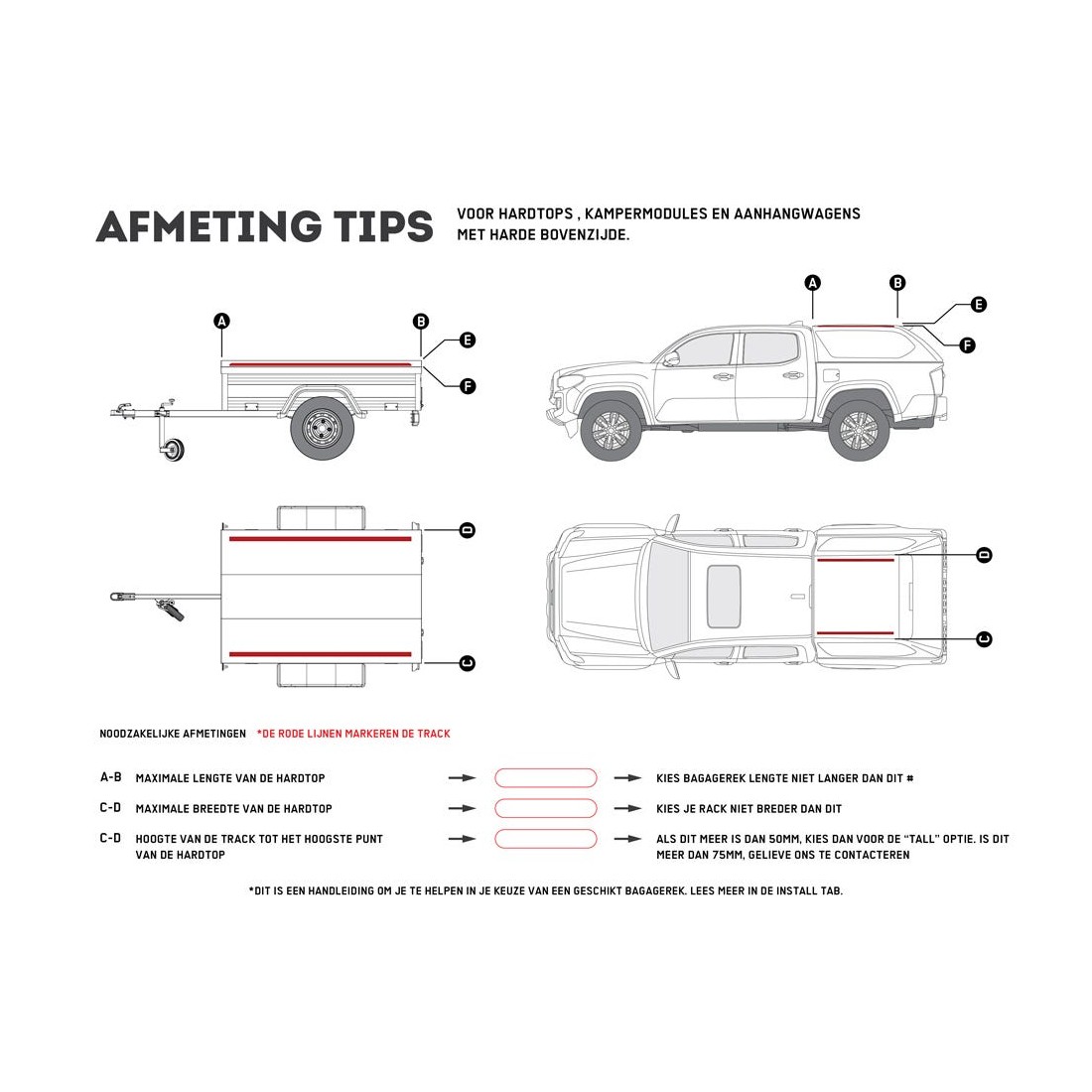 Ce kit de galerie est destiné au hard top de Pick-Up/aux cellules de camping et aux remorques qui ont une dimension de toit approximative de 1425mm/56.1'' (l) x 1560mm/61.4'' (L). Le plateau Slimline II s’installe sur les six (6) pieds fournis qui glissent dans les rails fournis. La paire de rail d'une longueur de 1500mm/59” peut facilement être montée sur votre hard top/cellule ou remorque. Regardez le guide d’installation pour le montage des rails dans l'onglet INSTALL pour plus de détails.