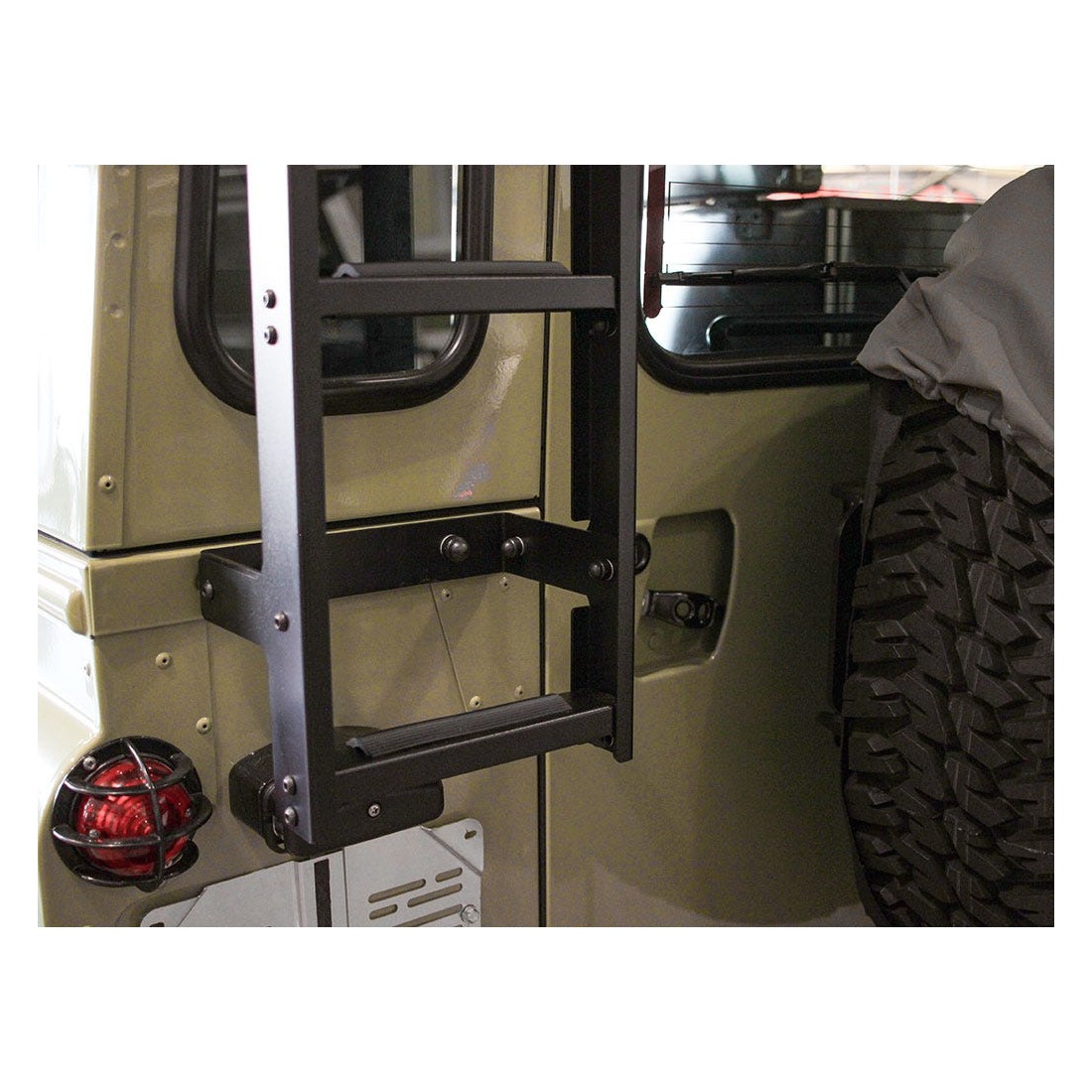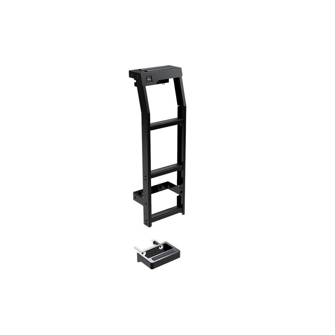 The ladder conforms to the contours of the vehicle and is made with off-road tough black powder coated high strength steel for maximum durability and strength. Easy installation: The top part of the ladder clamps onto the gutter and bolts to the vehicle body (drilling required). Bottom ''step'' mounts below the bumper using existing holes.