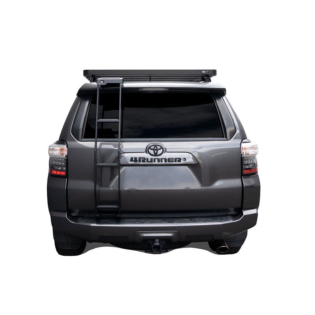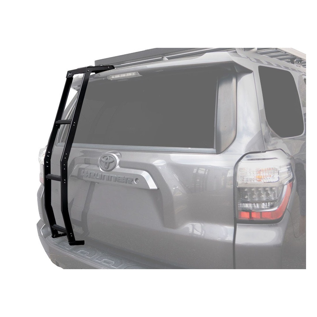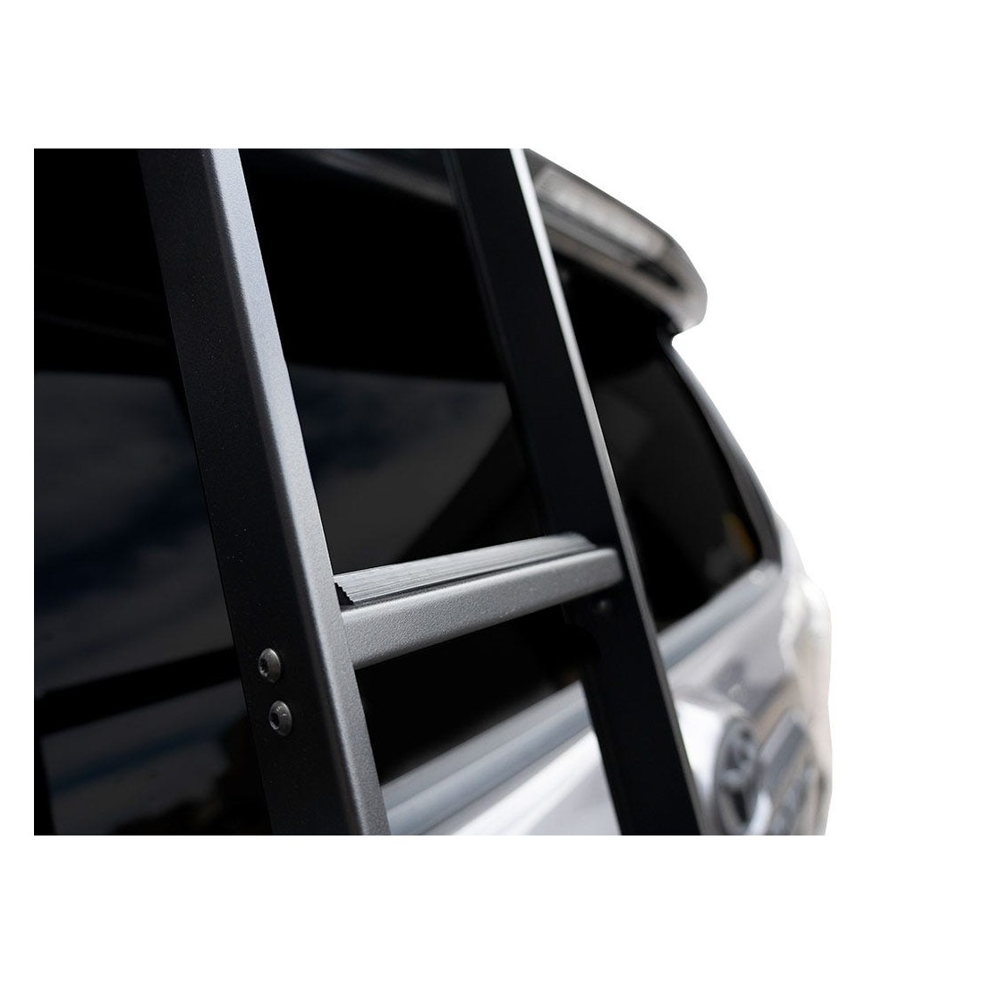 Provides easy access to your Front Runner roof rack. Clamps around the top and bottom of the rear door. No drilling or vehicle modification is required. Made from high strength steel and powder coated in the same durable black powder coating as all Front Runner racks.