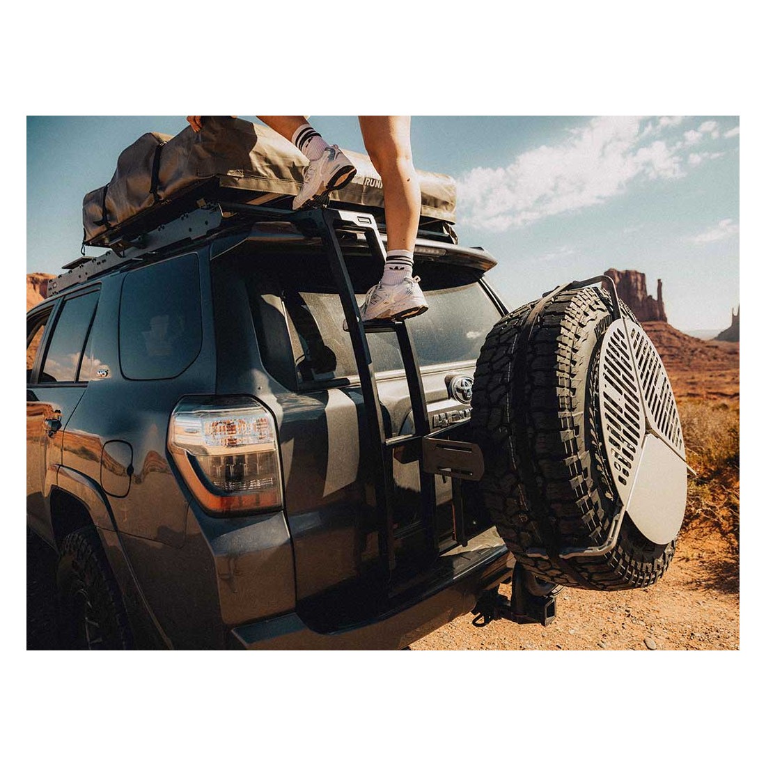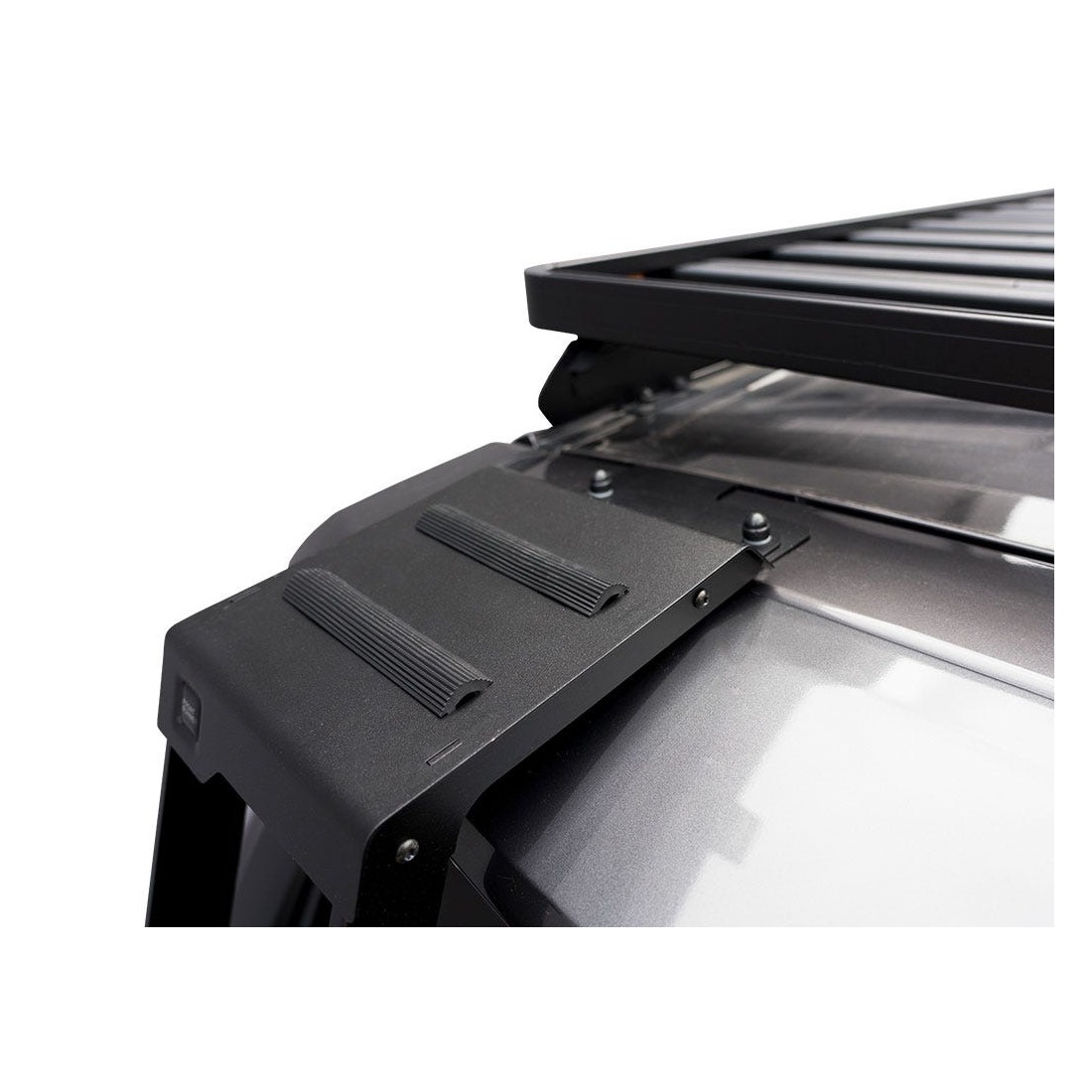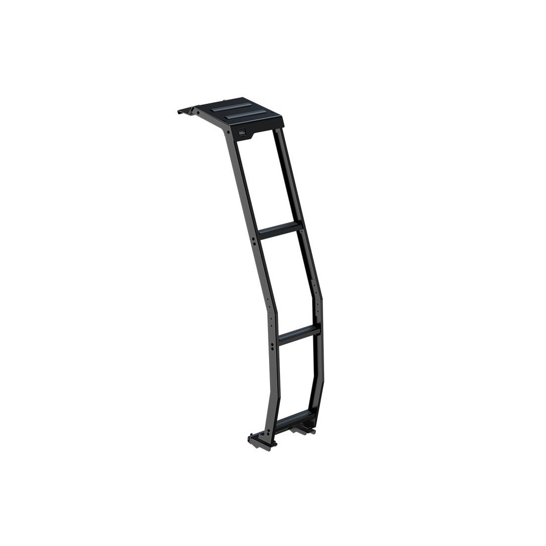 Provides easy access to your Front Runner roof rack. Clamps around the top and bottom of the rear door. No drilling or vehicle modification is required. Made from high strength steel and powder coated in the same durable black powder coating as all Front Runner racks.