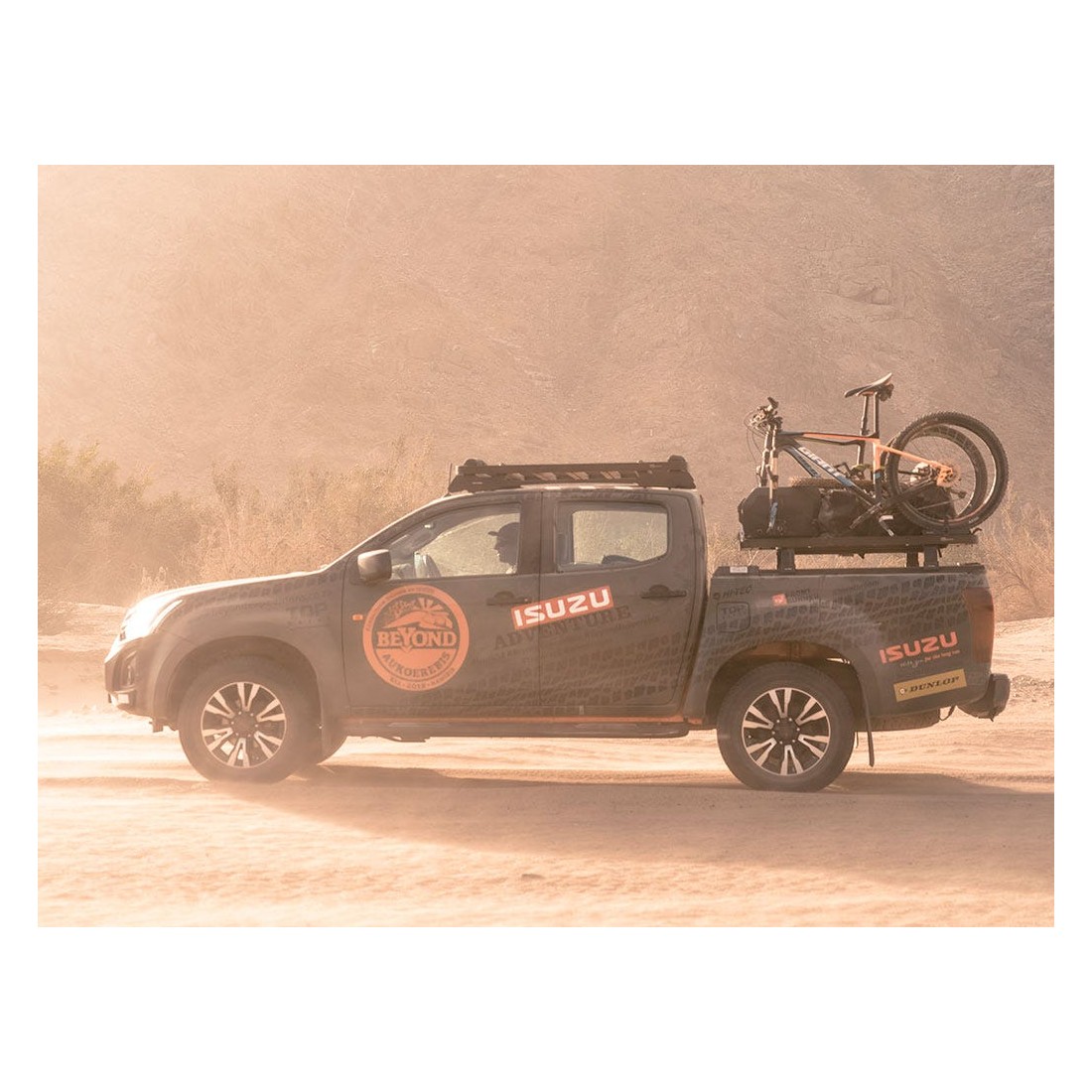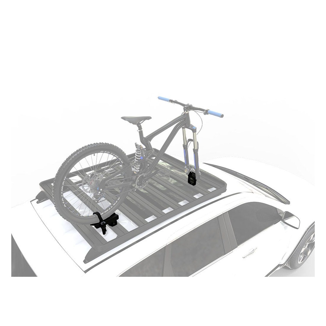 Un support Thru Axle pour des axes de 100mm x15mm et 110mm x 20mm Insertions incluses pour des Boost Hub de110mm x 15mm.Le support correspond également aux fourchesstyle ‘pince’ comme les Fox40, Manitou Dorado et Marzocchi 380.Le support de la roue arrière peut tenir unelargeur de roue de 700C x 23mm jusqu’à 26 x 4.5''.Le support de la roue arrière a une sanglepour une installation et un réglage rapide.Le support peut être placé sur une galerie ousur des barres de toit Front Runner.Ce support est fabriqué en acier et en époxy noir pour une durabilité et une longévité.NOTE: le montage sur une galerienécessite une longueur minimum de galerie de 1156mm (6 barres).