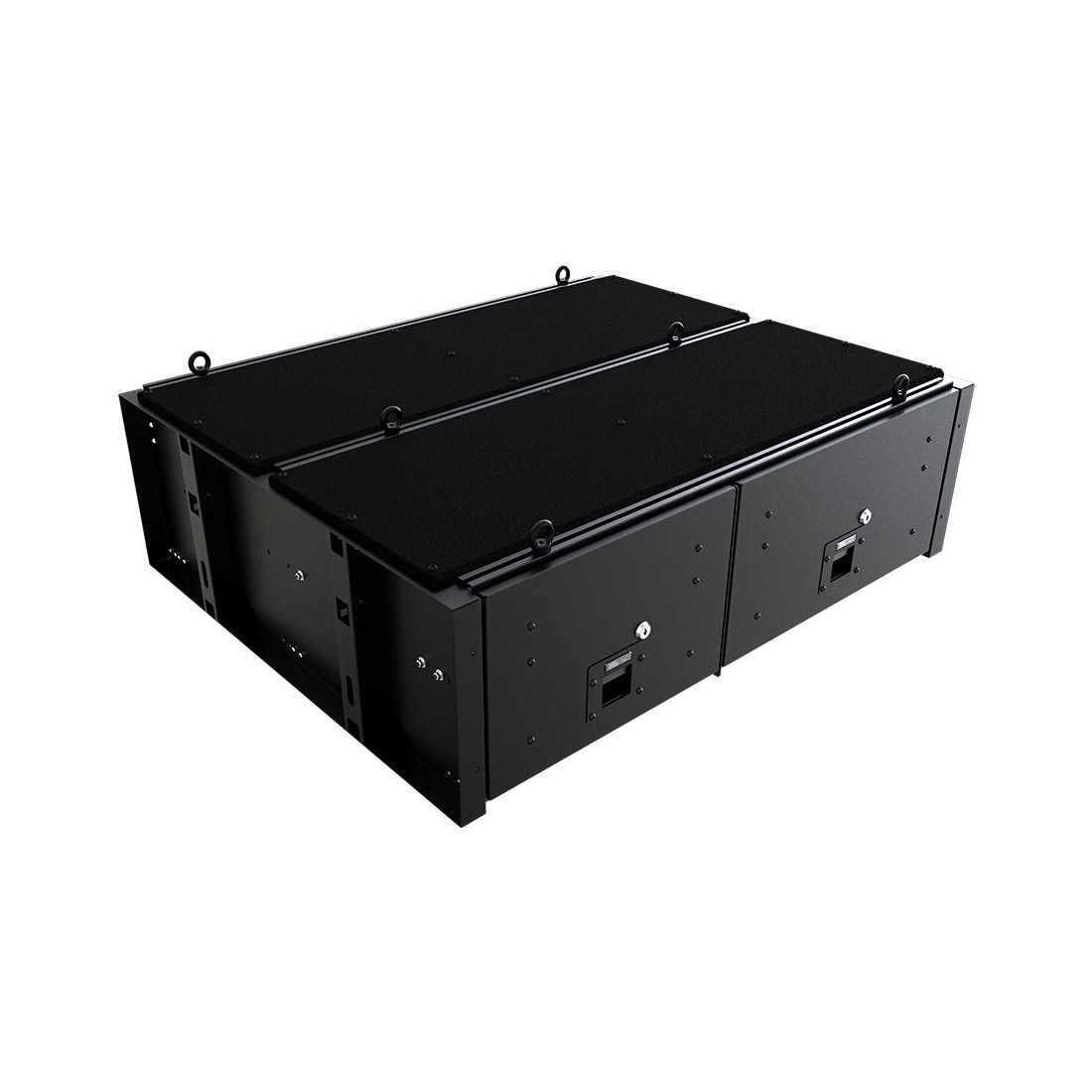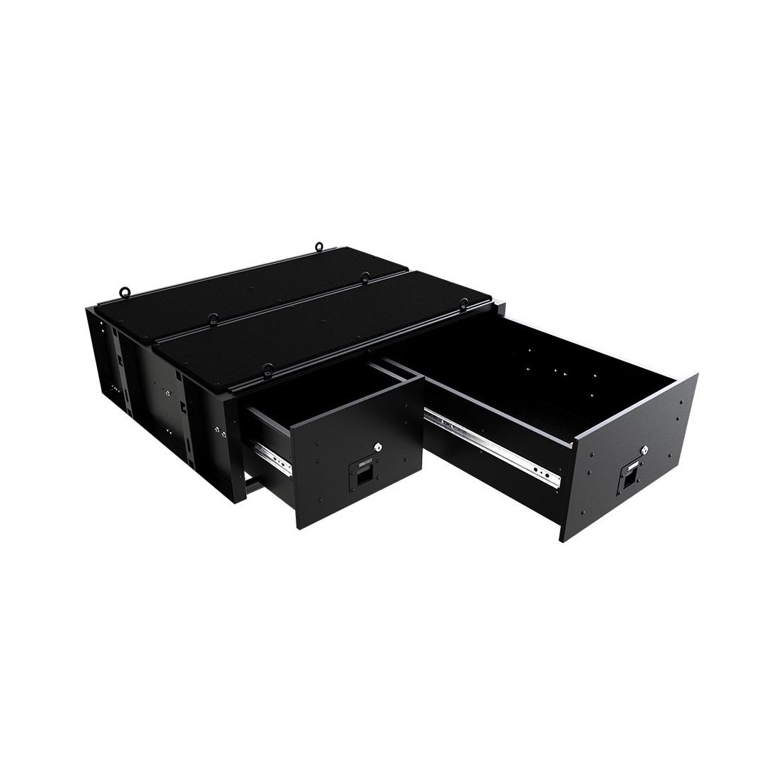 Si Front Runner n’offre pas de kit pour un véhicule spécifique, vous pouvez considérer celui-ci comme tiroir ‘universel’. Veuillez consulter les SPÉCIFICATIONS pour les mesures exactes du produit. Contient des tendeurs et des mousquetons pour faciliter l’installation aux véhicules avec des points de montage existants. Contientun tiroir large et un tiroir medium. Capacité de charge par tiroir: 113kg / 250 lb. Haute résistance permettant à chaque tiroir d'être ouvert à près de 100% sans risque de décrochage. Le tiroir procure une tranquillité d'esprit et assure la sécurité en verrouillant les tiroirs contenants des objets importants comme des ordinateurs, des smartphones et des caméras. La plaque contient 3 points d’arrimage et 6 SSCA047.Personnalisez vos configurations de stockage. Accumulez et sécurisez vos bagages, SBOX031, SBOX001, des boîtes en aluminium et d’autres conteneurs de stockage sur la plaque de couverture en utilisant STRA034. La plaque au-dessus des tiroirs peut également être utilisée pour monter des glissières pour frigo/charges de Front Runner.Pour créer l’option de boîtes amovibles, utilisez SBOX001 ou SBOX027 dans les tiroirs. La SBOX001 ou SBOX027 peuvent être utilisées pour le rangement et le déplacement d’objets.Si vous voulez créer des compartiments dans les tiroirs, ajoutez les séparateurs de tiroirs en acier SSCA050. Ceux-ci aident à organiser vos objets et à éviter les mouvements excessifs de l’équipement. Les séparateurs de tiroirs sont vendus en paire. Vous pouvez placer jusqu’à 4 séparateurs par tiroir. Le dessus de la plaque de couverture est recouvert d'une moquette en nylon, résistante aux UV.La moquette en nylon fait en sorte que les objets ne glissent pas et elle est résistante au bruit et aux vibrations. La finition en époxy noir est la même que la galerie Slimline II de Front Runner et d’autres produits Front Runner. Tous les systèmes de rangement de Front Runner sont couverts par une garantie de deux ans.Note: Ces tiroirs ‘universels’ ne sont pas fournis avec un set de plaque de couverture pour un véhicule spécifique.Si vous avez des questions au sujet de la correspondance du produit à votre véhicule, contactez-nous avant l’achat.*Veillez noter queles boîtes Cub Pack, Flat Pack et les séparateurs de tiroirs ne sont pas inclus dans le kit de tiroirs, mais sont vendus séparément.