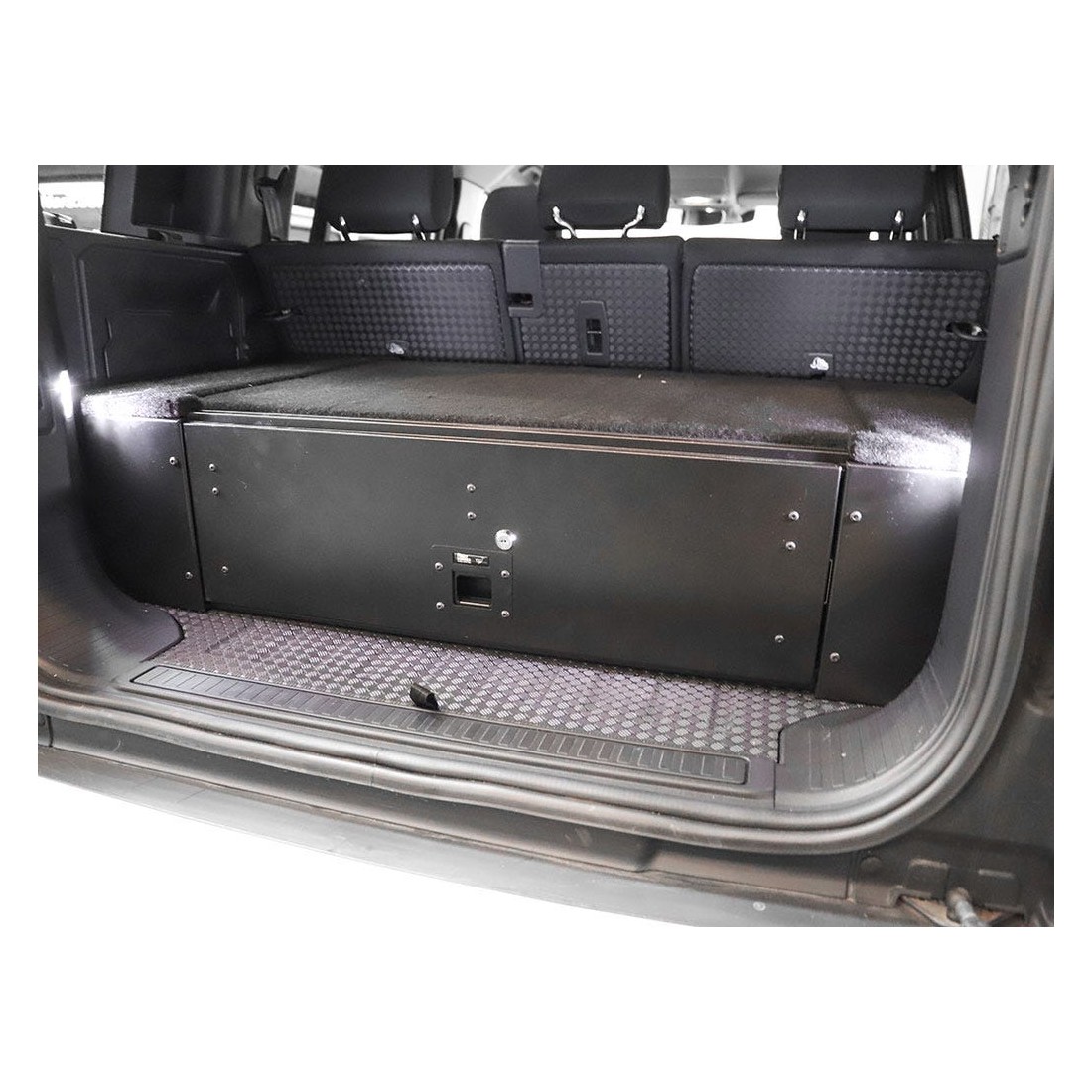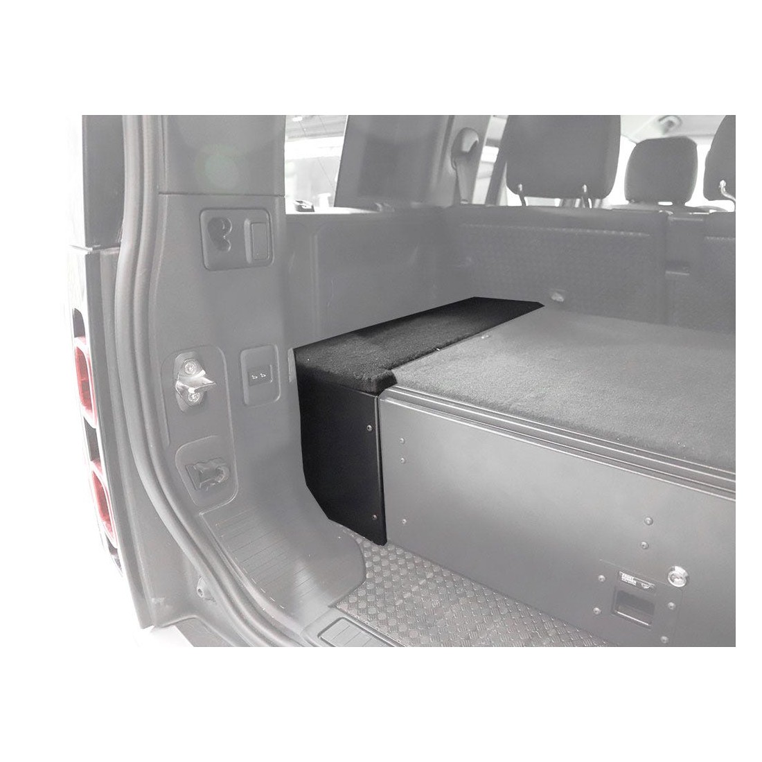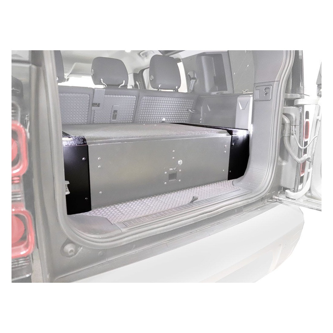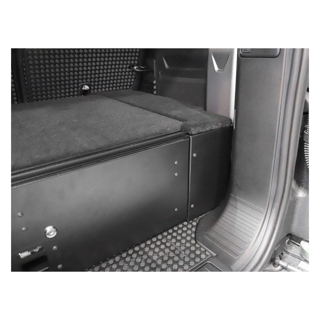 Un ensemble de finition de plateau en contreplaqué laminé pour le Land Rover Defender 110. Ces plateaux fonctionnent avec le tiroir du SUV / petite et sont profilés selon les contours du véhicule pour assurer un ajustement sur mesure.