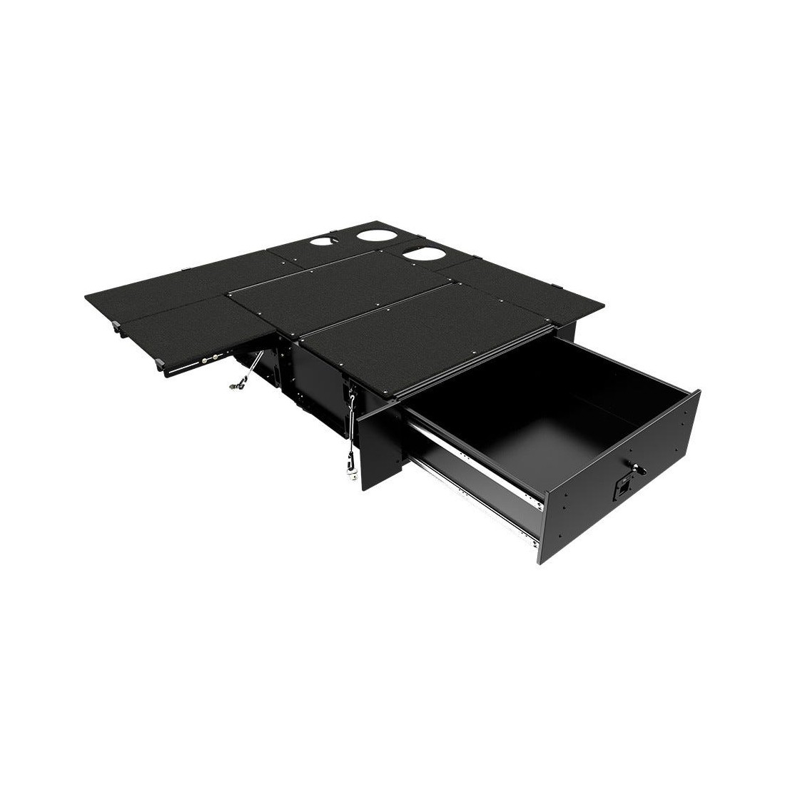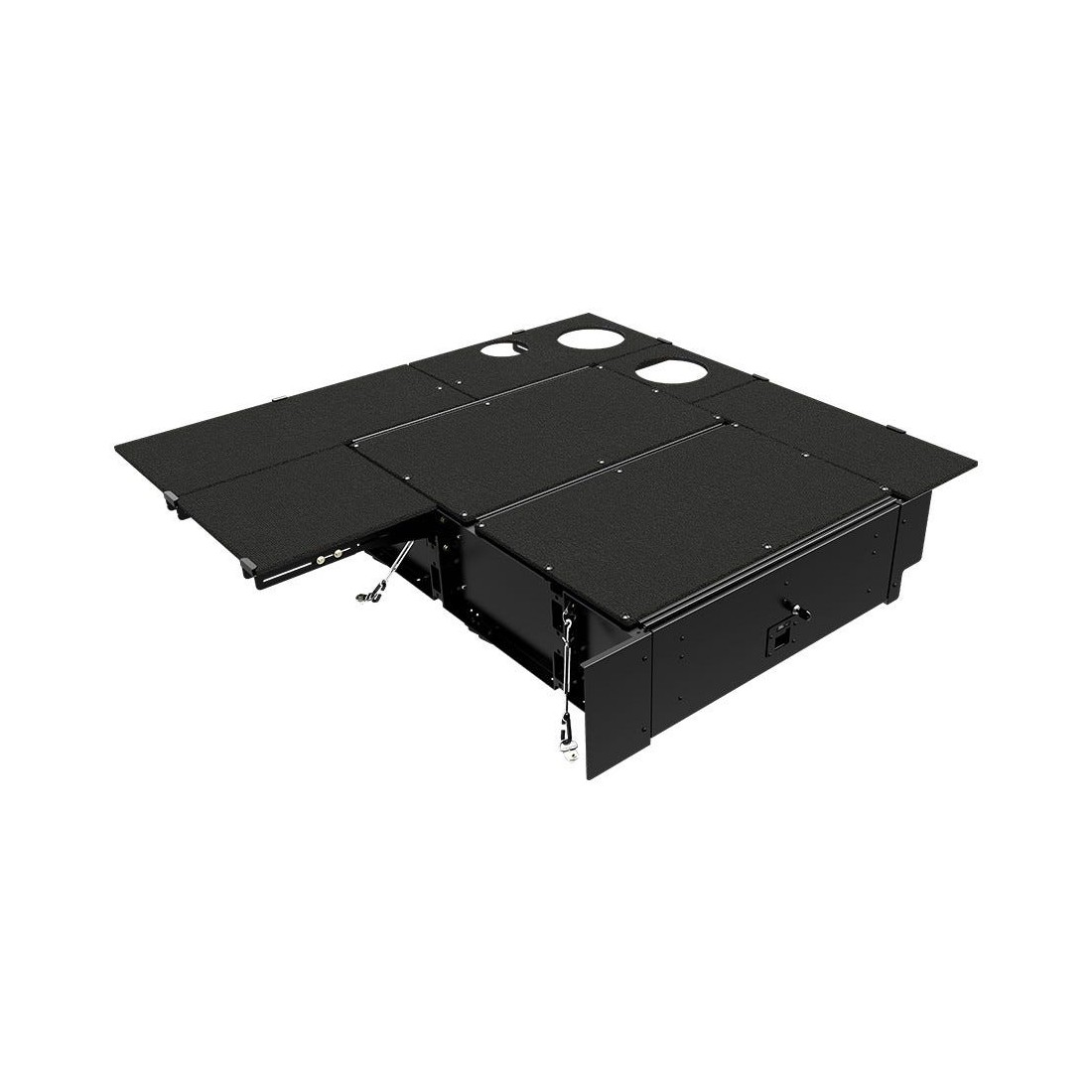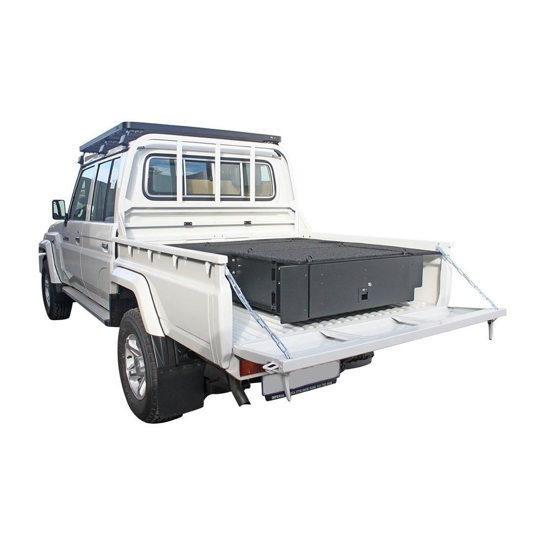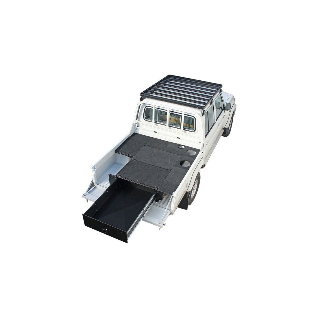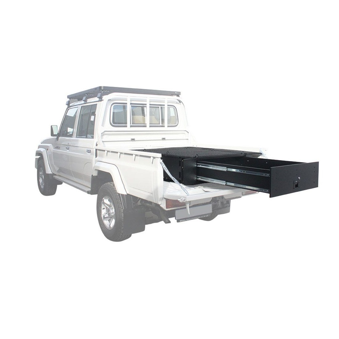 Le rangement de votre équipement et vos objets de valeur devient une évidence. Ce tiroir verrouillable a une plaque de couverture et des plaques frontales. Le tiroir a spécialement été conçu pour une Toyota Land Cruiser 79 DC. Il cache le contenu des regards indiscrets, crée un rangement plus efficace et facile à accéder. Les tiroirs sont conçus pour les aventures on road et off road.