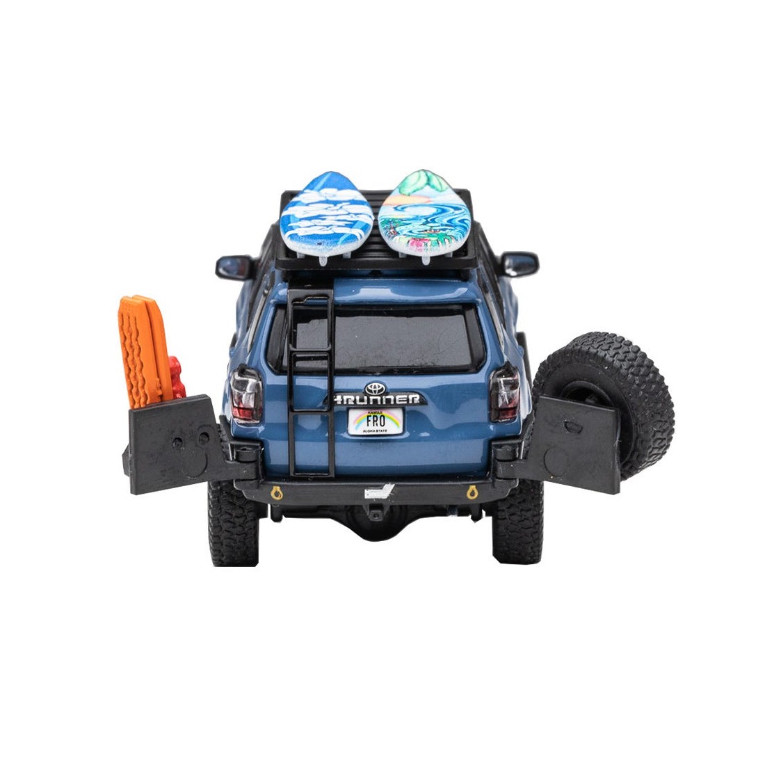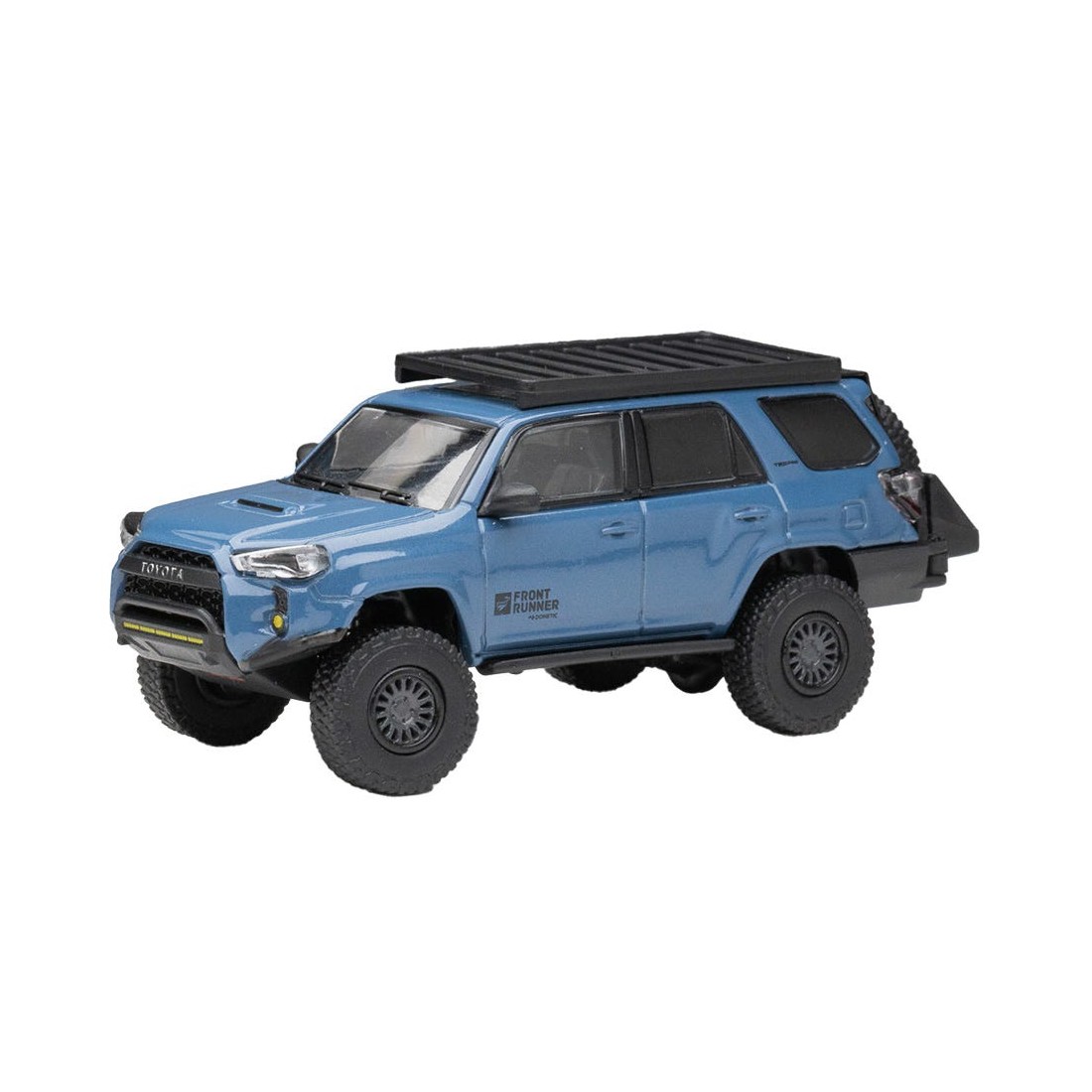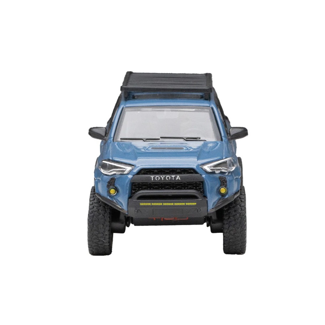 Limited Edition Toyota 4Runner TRD PRO Overland Cavalry Blue exclusive model. Randomly selected customers will receive the Special Edition Toyota 4Runner TRD PRO Overland Chrome Blue models. An individually numbered vehicle with accessories to a scale of 1:64. This full Diecast body and chassis, with TRD PRO Skid plate, features working suspension and steering with Front Runner Dometic accessories. Accessories include the Front Runner Dometic Roof Rack, opened Roof Top Tent, collapsed Roof Top Tent, ladder, Awning, Wolf Pack, Cub Pack, ROTOPAX, Water Tank, Bike carrier, Bikes, BBQ Grate, Traction boards and Jack.