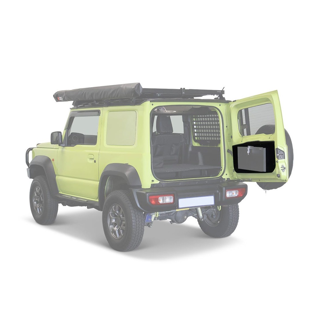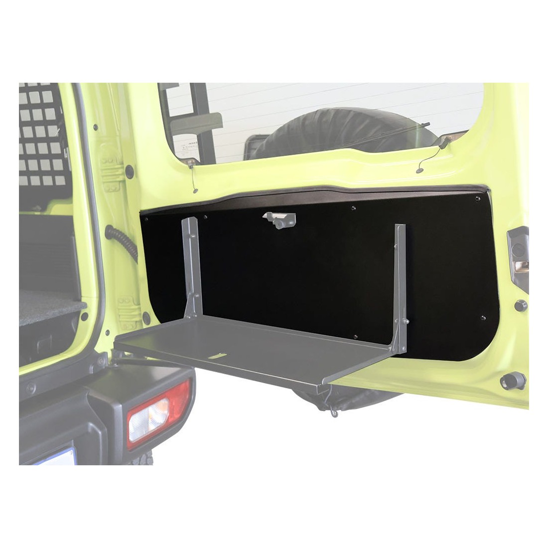Une plaque de base qui crée une surface plane pour installer la très utile table escamotable universelle. Cette plaque de base se monte dans la porte battante arrière du Suzuki Jimny, vous offrant ainsi une base solide pour la préparation des repas, le travail ou les loisirs.