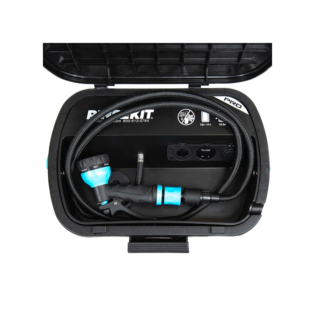 Pour encore plus de commodité, le RinseKit PRO est livré avec un chargeur pour prise auto et murale. Optez pour le RinseKit PRO et profitez de la puissance, de la capacité et de la facilité d'utilisation inégalées grâce à sa pressurisation alimentée par batterie. Il peut offrir une plage de températures étendue avec le thermoplongeur optionnel.