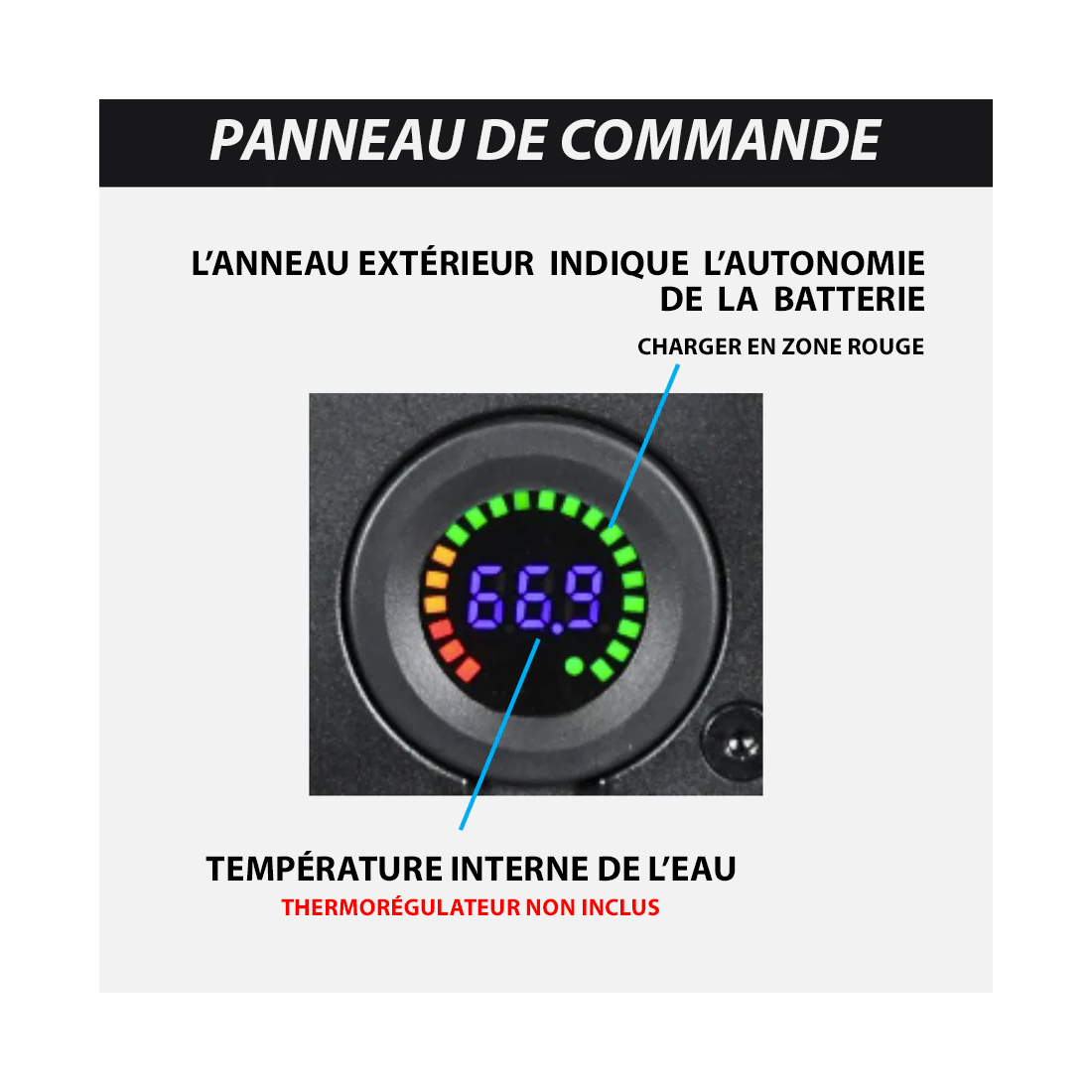 Le panneau de commande IP65 est étanche et résistant aux éléments de la nature, il affiche la température de l'eau et la durée de vie de la batterie.