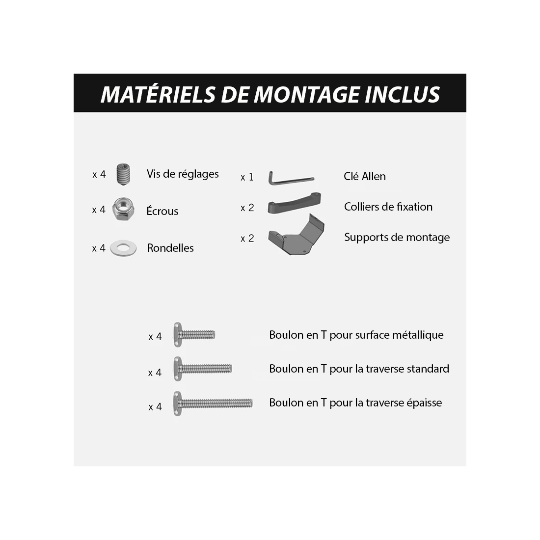 Cette douche peut-être fixée n'importe où, à la cage de la galerie de toit, à des barres normales, ou à des panneaux métalliques sur la paroi d'une camionnette par exemple.